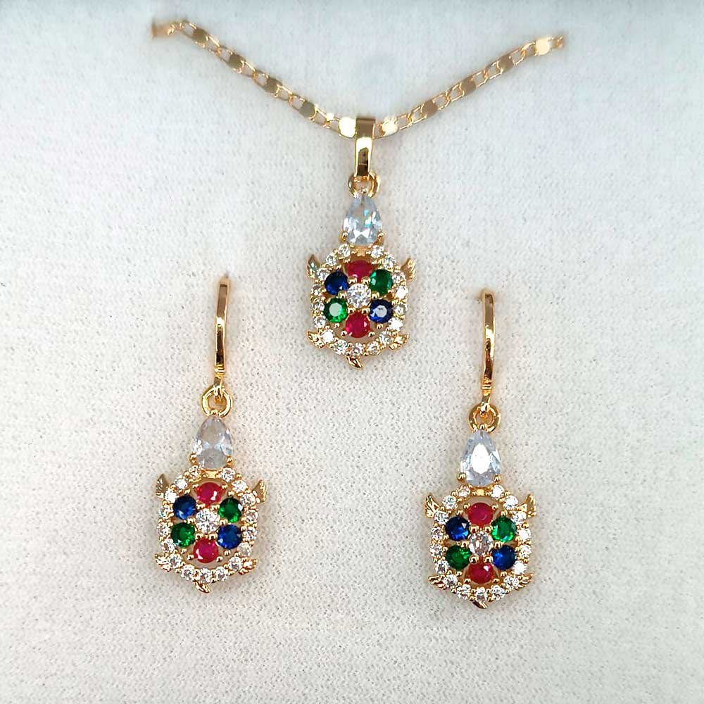 Oro laminado de 18 kilates, zirconias de colores, cadena de 45 centímetros de largo, dije de 25 mm de largo en total, aretes con cierre de gancho.